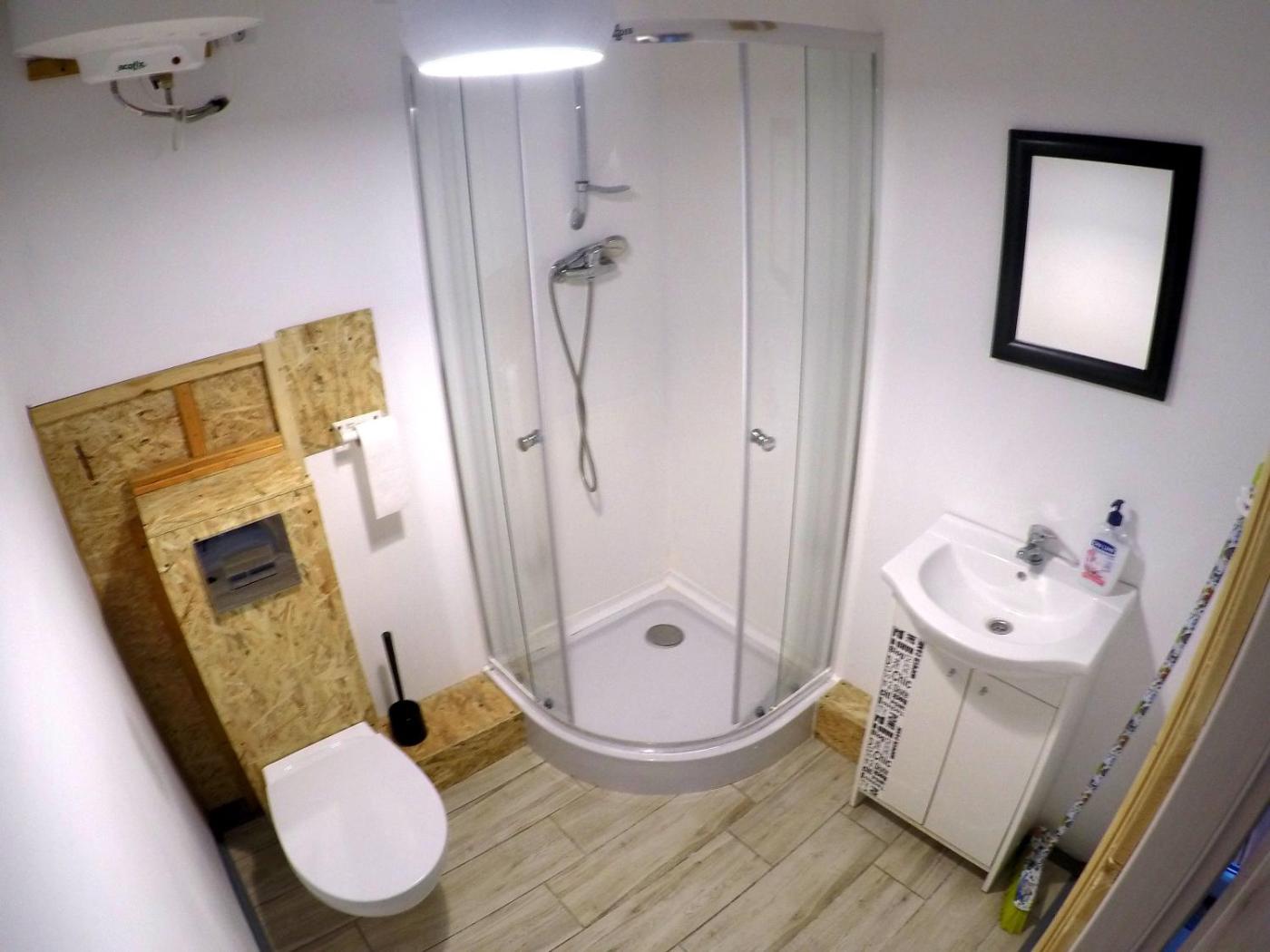 Pokój Czteroosobowy z balkonem. Jest to pokój czteroosobowy z basenem z widokiem na okolicę. Ten pokój czteroosobowy z oddzielnym wejściem i dźwiękoszczelnymi ścianami mieści łazienkę z kabiną prysznicową oraz suszarką do włosów. W kuchni znajdują się przybory kuchenne, lodówka i płyta kuchenna. Goście mogą korzystać ze sprzętu do grillowania. Udogodnienia obejmują balkon, jadalnię, szafę oraz telewizor z płaskim ekranem. W tej opcji zakwaterowania zapewniono 2 łóżka. Pokój Czteroosobowy - 4 osobowy. Powierzchnia pokoju ok.: 25 mkw. ;